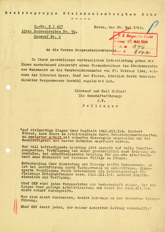 The telegraph from the OKW also reached the management of the Ruhr Coal Mining District Group. On 26 May 1944 they sent a circular to the mine directors informing them of the introduction of “performance rations”.