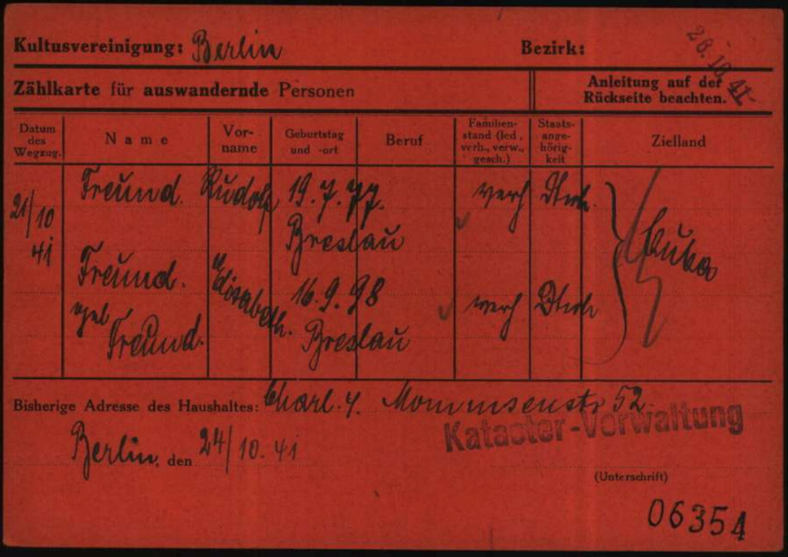 Im Jahr 1941 überschlugen sich die Ereignisse: Das Ehepaar Freund erhielt endlich eine Einreiseerlaubnis nach Kuba. Gleichzeitig verschlimmerte sich die Situation der Juden:Jüdinnen in Deutschland: Die Ausreisegesetze waren verschärft worden, Gerüchte über bevorstehende Deportationen mehrten sich. Über einen alten Kollegen, der Kontakte zur Geheimen Staatspolizei (Gestapo) hatte, erhielten die Freunds eine Sondergenehmigung zur Ausreise. Kurz bevor sie nach Paris aufbrachen, erfuhren sie, dass viele Berliner Juden:Jüdinnen zu einer Sammelstelle, der Synagoge in der Levetzowstraße, gebracht wurden, um von dort aus nach Polen deportiert zu werden. Die Freunds konnten am 19. Oktober 1941 Deutschland verlassen, kurz darauf erließ das NS-Regime ein endgültiges Ausreiseverbot für Juden und Jüdinnen.