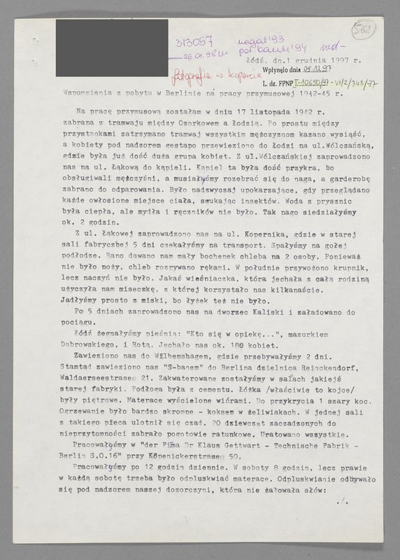 Nach 1945 sind zahlreiche Zeugnisse in Form von schriftlichen Erinnerungsberichten und Videointerviews entstanden. Im Zuge der Forderung nach Entschädigung haben viele ehemalige Zwangsarbeiter:innen Briefe verfasst, in denen sie ihren Lager- und Arbeitsalltag schildern, um ihr Schicksal zu belegen. So berichtet beispielsweise die polnische zivile Zwangsarbeiterin Maria Andrzejewska, geborene Kawecka in ihrem Brief an die Berliner Geschichtswerkstatt vom 1. Dezember 1997 über ihre Verschleppung ins Deutsche Reich und ihre Erfahrungen während der Zeit der Zwangsarbeit in Berlin in den Jahren 1942 bis 1945.